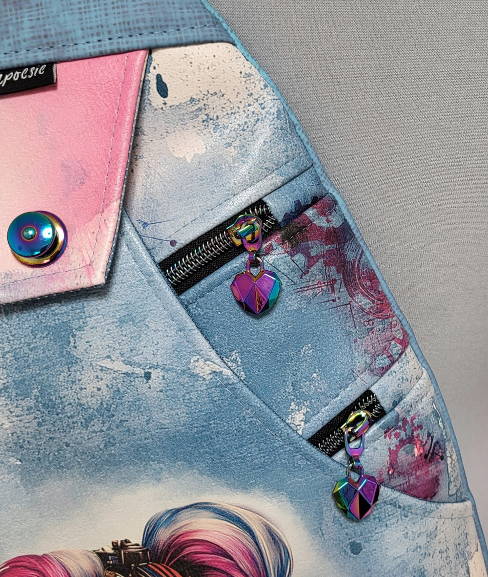 Kunstlederpanel "Ophelia" in Kombination mit Kunstleder Grungeezy blau GLOW IN THE DARK (leuchtet im dunkeln), Innenfutter wasserfester Oxford, Verstärkung Ronofix, hochwertige Reißverschlüsse und Zubehör aus Metall (rainbow).