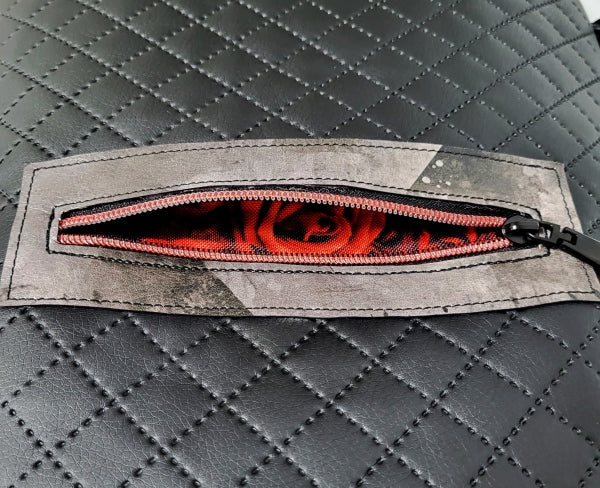 Motiv "La Catrina 9" aus Kunstleder in Kombination mit dem hochwertigem Kunstleder Denim Grain schwarz und Samsa gesteppt, Innenfutter wasserfester Oxford Rosen dunkelgrau, Verstärkung Ronofix, hochwertige Reißverschlüsse und Zubehör aus Metall (schwarz).